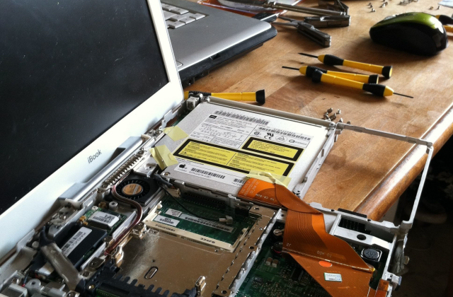 It started Saturday while cleaning out the shed: I found my two old Apple iBooks, dead, but still resting comfortably in their cases. My 12″ iBook suffered a motherboard failure five years earlier, and the iBook G4 14″ lost its mind when the hard drive crashed. At the time it was too expensive to get either repaired as both had gone out of warranty, so they were banished to the shed.